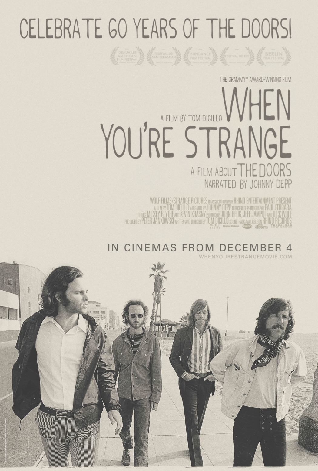 The chemistry of four artists made The Doors one of America’s most influential rock bands. With rare footage shot from their formation in 1965 to Jim Morrison’s death in 1971, When You’re Strange, Tom DiCillo’s GRAMMY® Award-Winning film narrated by Johnny Depp, follows the band through their career, providing insight into the revolutionary impact of their music. On the occasion of the band’s 60th anniversary, the film will be presented in cinemas in 4K for the first time ever, and feature a newly recorded performance of “Riders on the Storm” featuring John Densmore, Robby Krieger, and special guests performing the song in exotic locations around the world in partnership with Playing For Change.